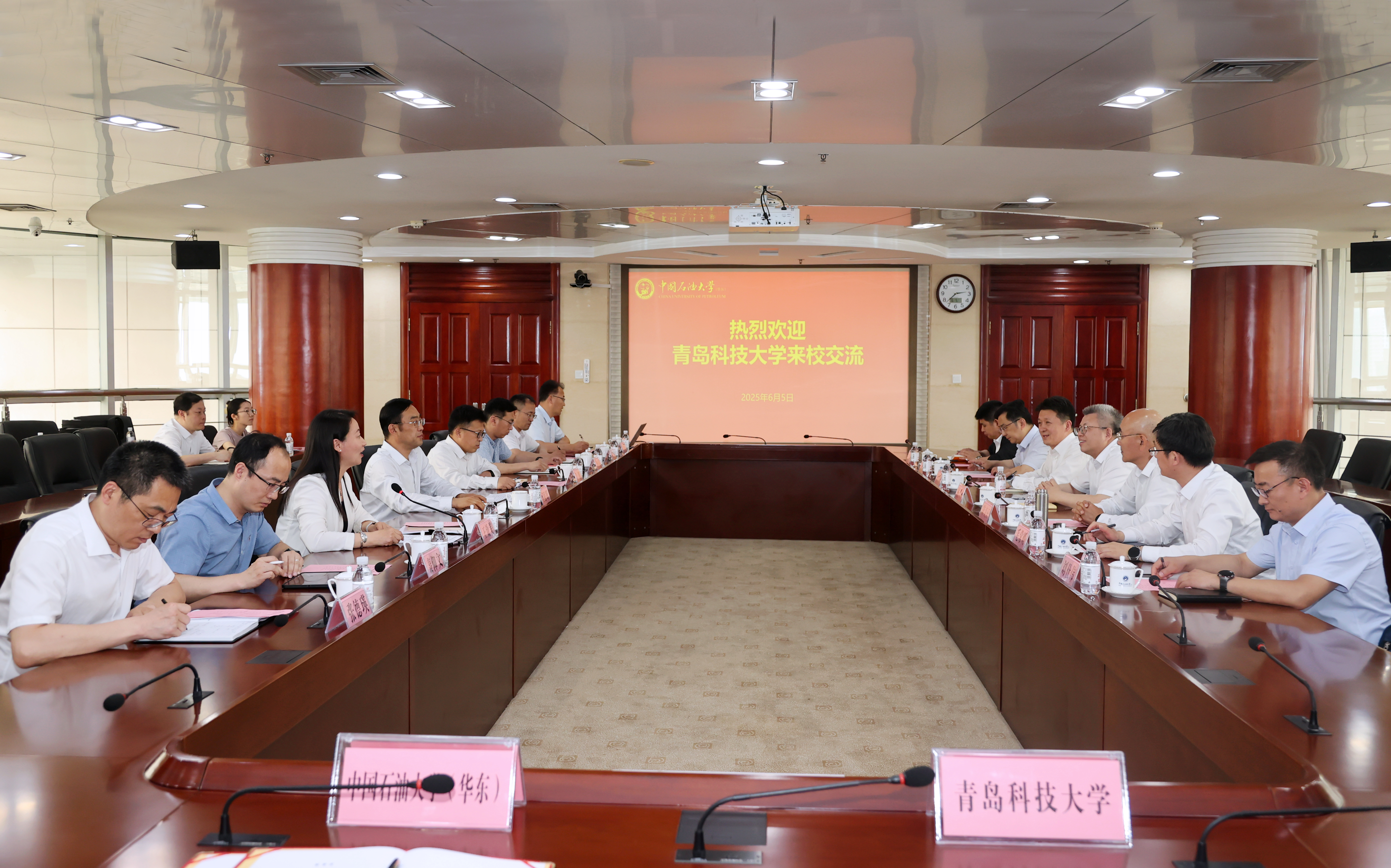 6月5日下午,党委书记杨天梅、校长陈克正带队赴中国石油大学(华东)签署两校全面战略合作协议。中国石油大学(华东)党委书记吴强明,党委常委、副校长周鹏,学校党委常委、副校长吴明铂出席签约仪式。仪式由中国石油大学(华东)校长助理王效美主持。